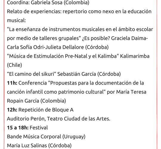 La programación académica está orientada a músicos, compositores, docentes, comunicadores, gestores culturales, productores e interesados en la cultura para la infancia. Uno de los propósitos del encuentro es que los docentes y agentes vinculados a la infancia puedan conocer y usar las diversas propuestas artísticas del mapa sonoro latinoamericano para multiplicarlo en su labor de todos los días. Este evento está organizado por el Mocilyc (Movimiento de la Canción Infantil Latinoamericana y Caribeña), a través del Momusi (Movimiento de Música para Niñas y Niños Córdoba).