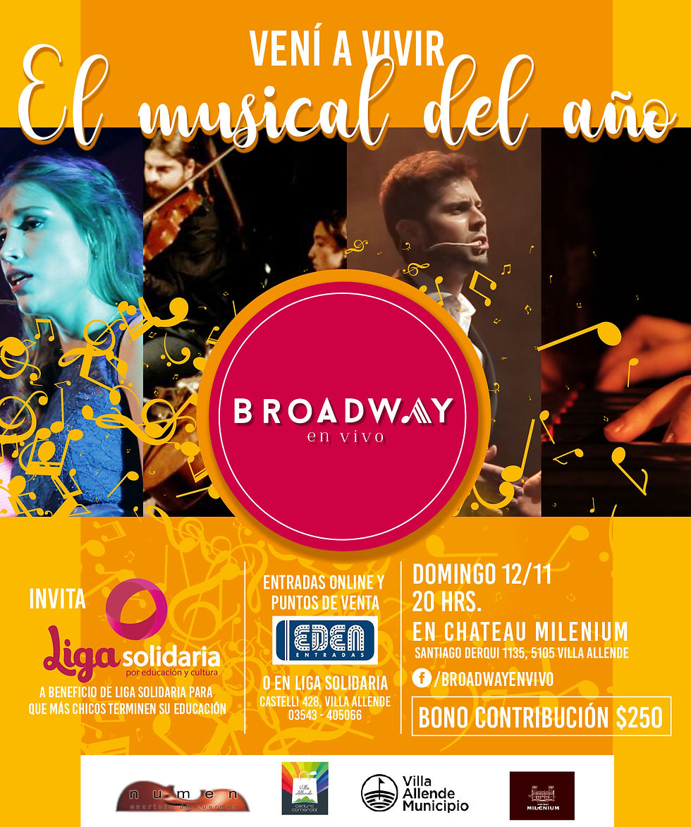 El domingo 12 de noviembre a las 20 en Chateau Milenium (Derqui 1135, Villa Allende) se presenta "Broadway en vivo", orquesta de cámara y voces en concierto.