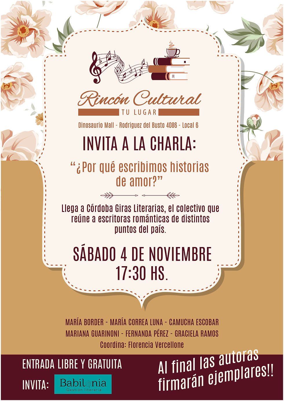 El próximo sábado 4 de noviembre, a partir de las 17.30, el colectivo Giras Literarias (integrado por autoras de distintos puntos del país) llegará a Córdoba para compartir con lectoras y lectores la charla “¿Por qué escribimos historias de amor?”.
