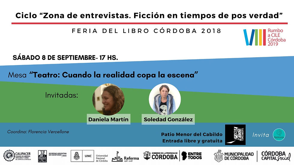 Tras la charla "Teatro: cuando la realidad copa la escena" con Soledad González y Daniela Martín, el ciclo "Zona de entrevistas: Ficción en tiempos de pos verdad" continuará el sábado 15/9 con Carola Ferrari y Mariela Giménez quienes se referirán a "Mujeres invisibilizadas: la cuestión de género en la literatura".