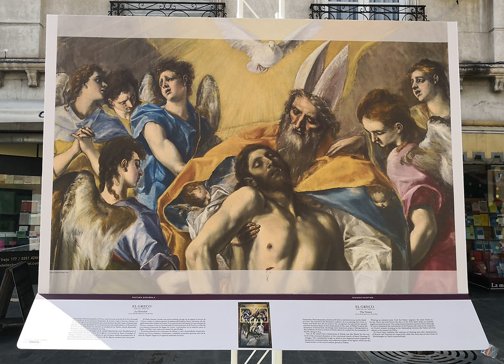 Detrás del cartel rojo leemos una reseña del Museo del Prado, inaugurado en 1819 por el Rey Fernando VII en Madrid, España. El mismo, posee más de 8200 pinturas que provienen de distintos museos, del Estado y de las Colecciones Reales históricas, ya que los reyes tuvieron un gran interés por las artes plásticas, decorando con cuadros sus palacios e instituciones religiosas. 53 de éstas obras, son las que se distribuyen en las tres cuadras de la muestra que inauguró con el Festival de la Palabra.